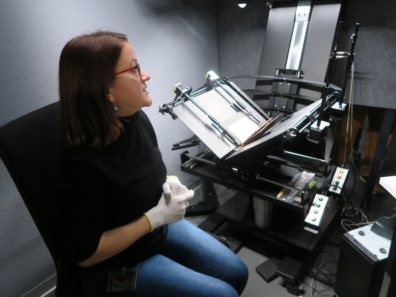 Im zweiten Teil der Führung wechseln wir im gleichen Hause ins Digitalisierungszentrum und lernen dabei diejenigen Arbeitsabläufe etwas genauer kennen, die für die Bereitstellung historischer Materialien auf der Plattform www.e-manuscripta.ch erforderlich sind. Es wurden uns die neusten Apparte vorgestellt, welche es ermöglichen, Bücher zu digitalisieren, die nur bis 90 Grad aufklappbar sind. Was Lavater betrifft, ist diese Form der digitalen Bereitstellung auch die Voraussetzung für die Arbeit an der Lavater-Edition der Universität Zürich.