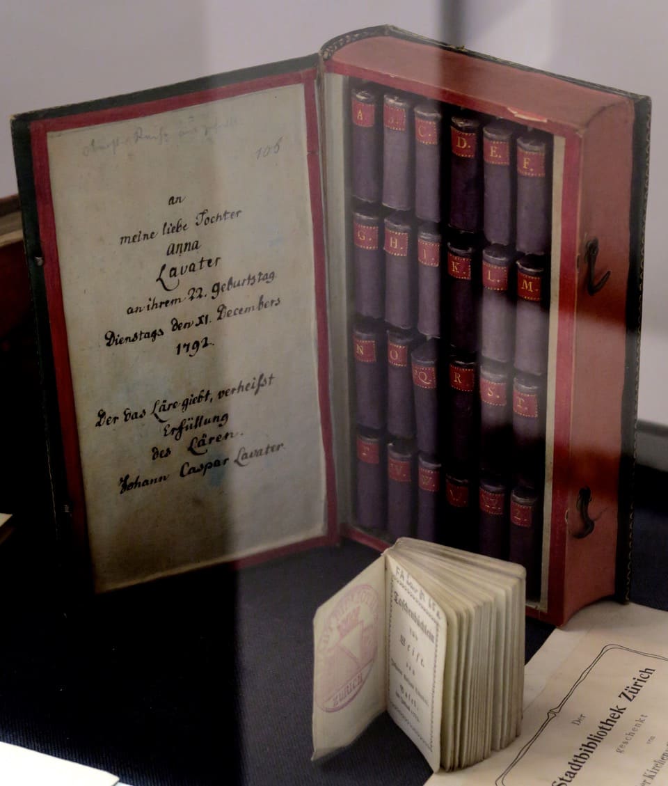 Wir besichtigen, die in eine Schenkung umgewandelten Lavater-Exponate in der Zentralbibliothek in Zürich. Bei der Schenkung handelt es sich um ein Kästchen mit Miniaturbüchern die Johann Caspar Lavater seiner Tochter Anna zum 22 Geburtstag geschenkt hat. Darüber hinaus sehen wir eine attraktive Auswahl thematisch zugehöriger Archivalien aus dem reichen 18. Jahrhundert-Bestand der Zentralbibliothek vogezeigt und sachkundig erläutert.